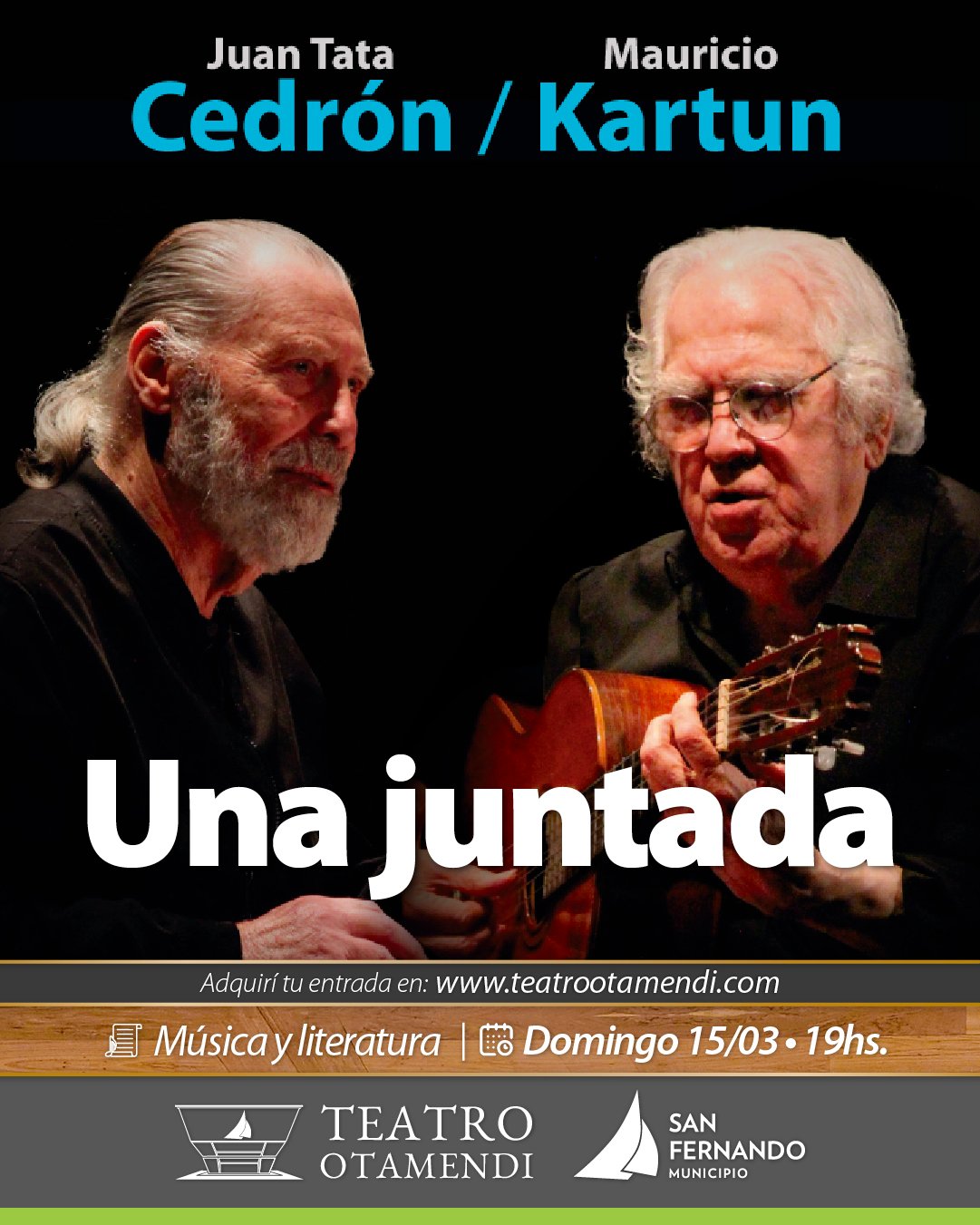 Juan Tata Cedrón y Mauricio Kartun se juntan para compartir y recrear, en un clima intimista, un diálogo entre canciones y textos, músicas y palabras, memoria y sueños.